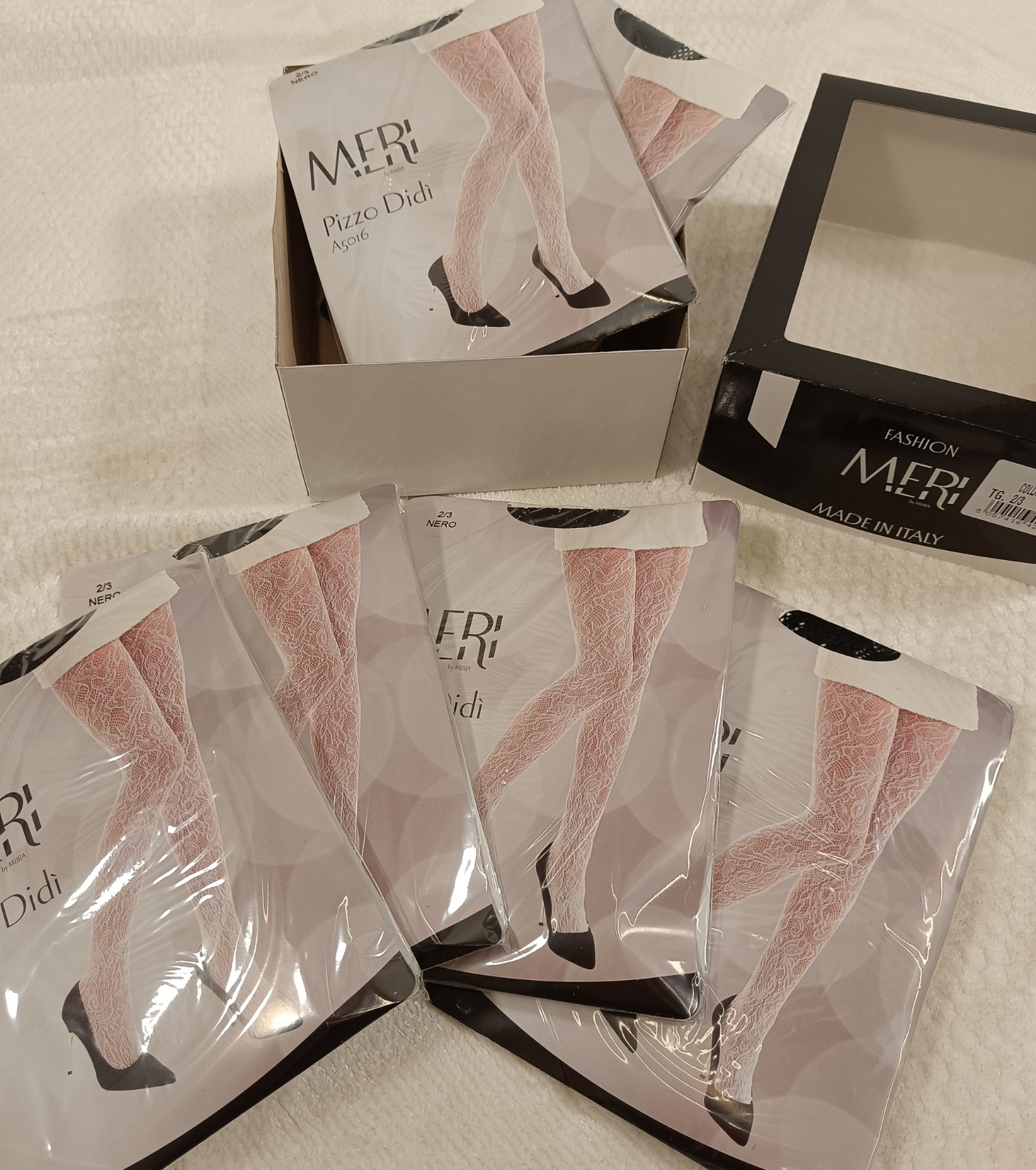 Collant donna a rete con disegno pizzo. Scatola da 6 pezzi.